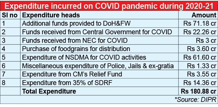 In terms of expenditure incurred for COVID response during 2020-2021, a total of Rs 180.88 crore was spent on activities which included additional funds to the Department of Health and Family Welfare, expenditure of the of NSDMA, and purchase of food grains for distribution, among others. (See Table)