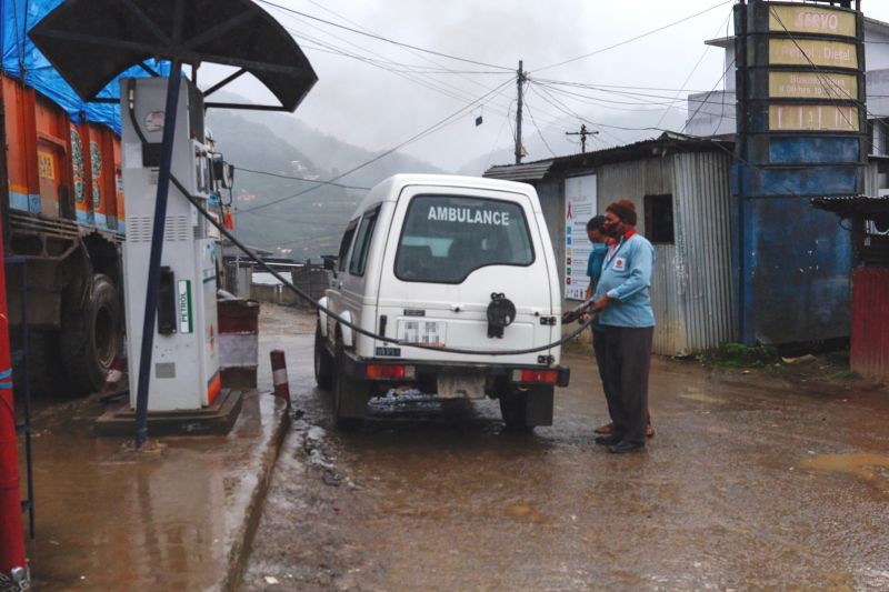Amid the ongoing statewide lockdown, a worker fills petrol in an ambulance at a fuel station in Tuensang on June 28. (Morung Photo by Moses Hongang Chang)