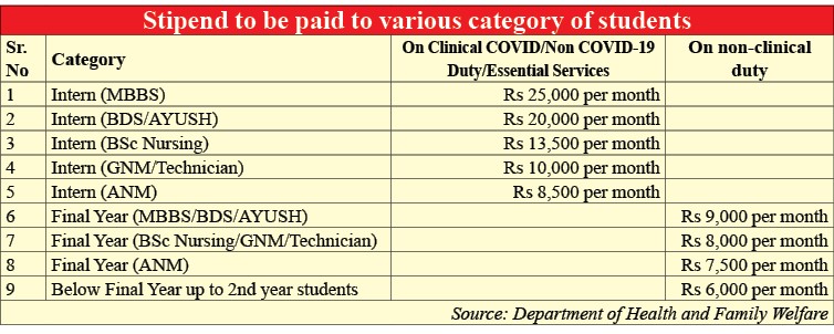 Specifying the stipend to be paid to various categories of students (See Table), the notification stated that “the budgetary allocation for 2020-21 and as available in the Civil Deposit, for the purpose of stipend would be initially used, and would be sub-allocated to the Chief Medical Officers of the respective districts as per their requirement immediately.”