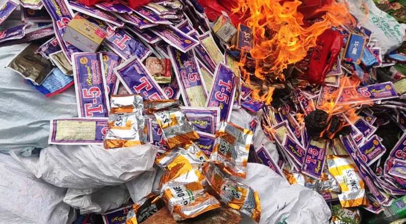 Seized tobacco products were destroyed by the enforcement team of District Tobacco Control Cell and North Police Personnel at North Police Station premises in Kohima on June 22. (DIPR Photo)