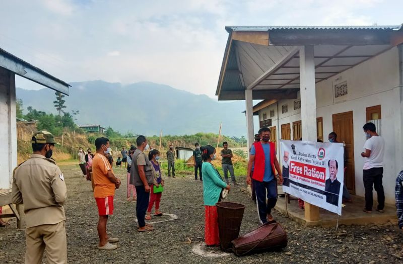 Beneficiaries stand in queue during the free ration distribution of Pradhan Mantri Garib Kalyan Anna Yojana (PMGKAY) at Pathso Nokeng village, under Noklak district on May 31. PMGKAY is a food security welfare scheme launched by the Government of India during the COVID-19 pandemic. (Photo Courtesy: Khumong T)