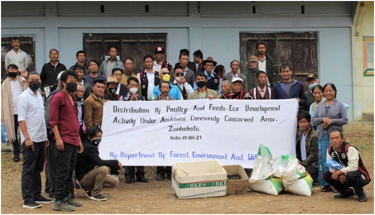 Distribution of Poultry feeds as part of an eco-development activity for the Community Conserved Areas (CCAs) was conducted on June 19 at Aseukhomi village under Zunheboto district. The programme was sponsored by Ministry of Environment Forests, Government of India and Department of Environment, Forests and Climate Change, Government of Nagaland. The Village Community Reserve Management Committee expressed gratitude to the Forest Department for their support and reaffirmed its aim to continue conservation efforts.