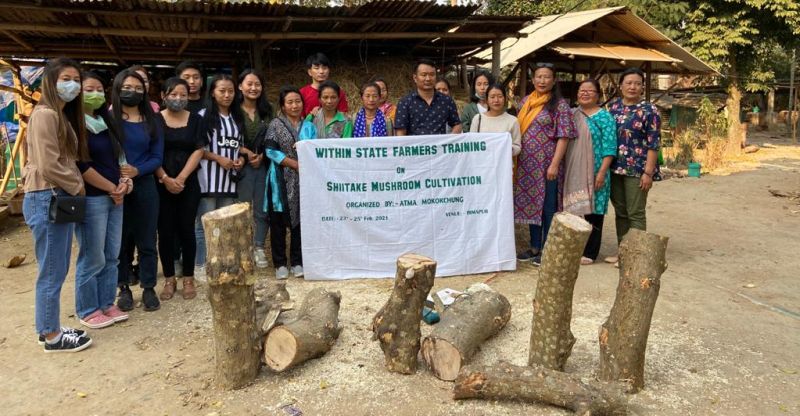 ATMA Mokokchung organised training on Shiitaki Mushroom cultivation for farmers hailing from Mokokchung district at Kashiram Dimapur. Seen in the picture Dr.Sosang Longkumer the main resource person along with the interns of SASRD Medziphema and the farmers from Mokokchung on 19th February 2021. ( DPRO Dimapur)