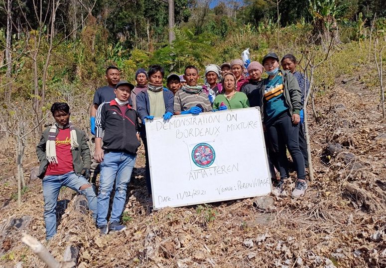 ATMA Peren block conducted demonstration at three farm schools at New Puilwa, Peren village and Mhainamtsi village on February 11 and 12. Fishery Demonstrator, Peren Chubatemjen; ATM Peren block Kibale and ATM Peren block Kekiepeu Nza were the resource persons. Neem oil, Bordeaux mixture, hand gloves, hand sprayer, and seeds were distributed to the 15 farmers who attended the demonstration. (Photo Courtesy: ATMA Peren block)