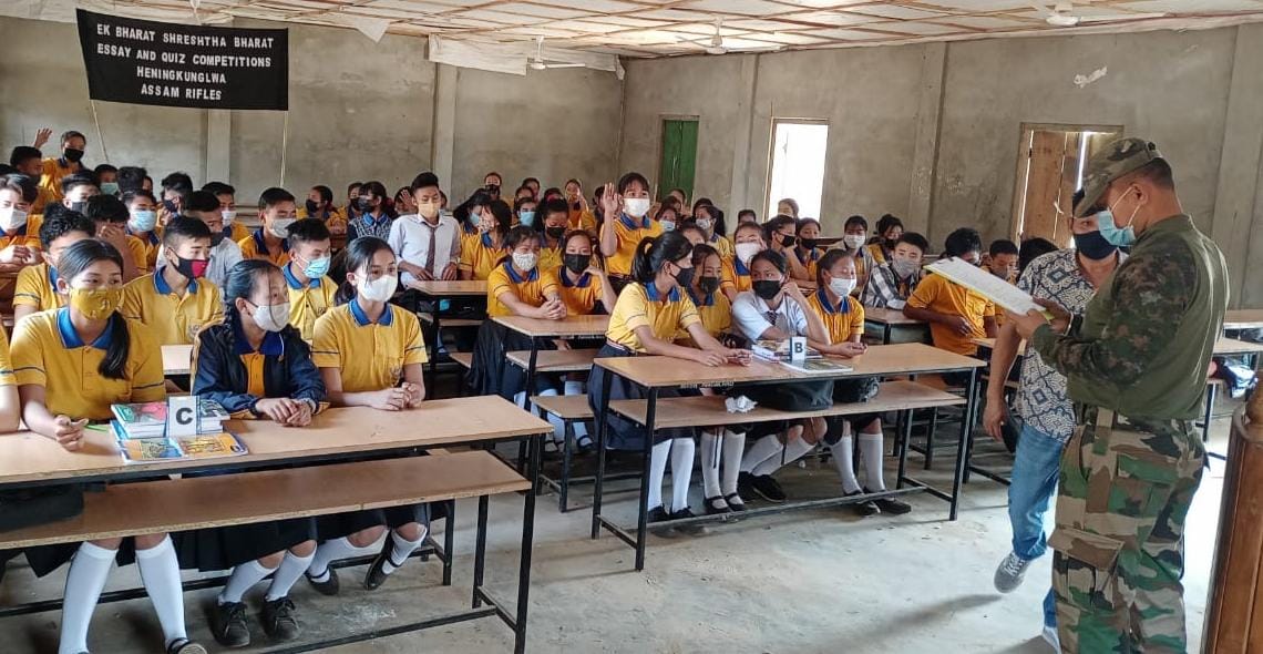 Jalukie Battalion of Assam Rifles under the aegis of HQ IGAR (North) conducted a quiz competition under ‘Ek Bharat Shreshtha Bharat’ campaign at Government Higher Secondary School Peren on February 24. Six teams of two students each participated in the competition which as witnessed by a total of 119 students. It concluded with prize distribution to the winners and runners up. (Photo Courtesy: IGAR North)