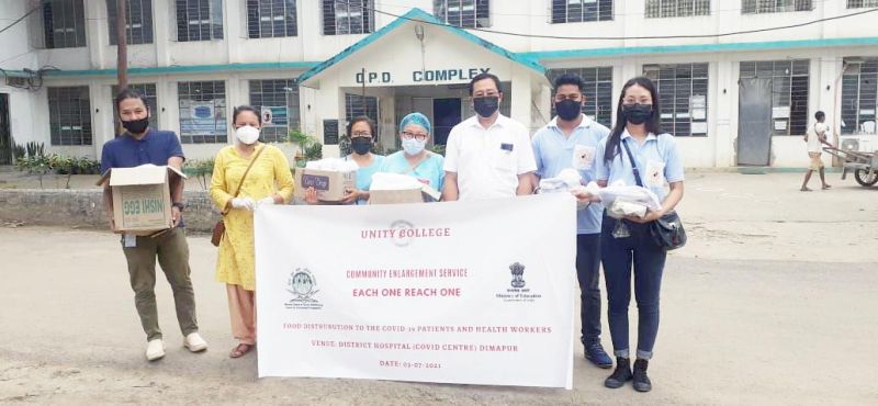 Swachhta Action Plan, Unity College Dimapur organized ‘food distribution program’ to the COVID-19 patients and health workers on July 3. The team visited District Hospital Dimapur and COVID Centre DC Complex Chumukedima and distributed food packages. The programme was organized under Mahatma Gandhi National Council of Rural Education mission of ‘Each One Reach One’. (Photo Courtesy: Unity College)