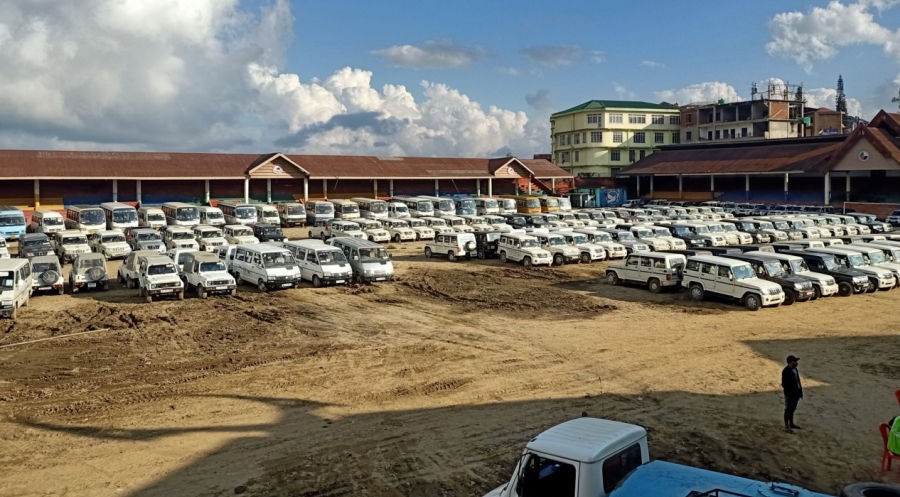 Vehicles requisitioned for bye-election to the 14th Southern Angami -1 Assembly Constituency parked at Khuochiezie Local Ground, Kohima on October 28. (DIPR Photo)