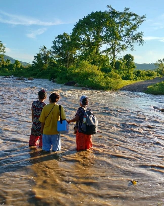 Health workers cross a river to administer Routine Immunization at Beisumpui village, Peren district. In this image tweeted by National Health Mission (NHM), Nagaland on June 25 last, it wrote ‘health workers are tirelessly working despite bad weather and difficult terrain, not to leave out any child in getting their Routine Immunization.’ (Photo Courtesy: Twitter/NMH Nagaland)