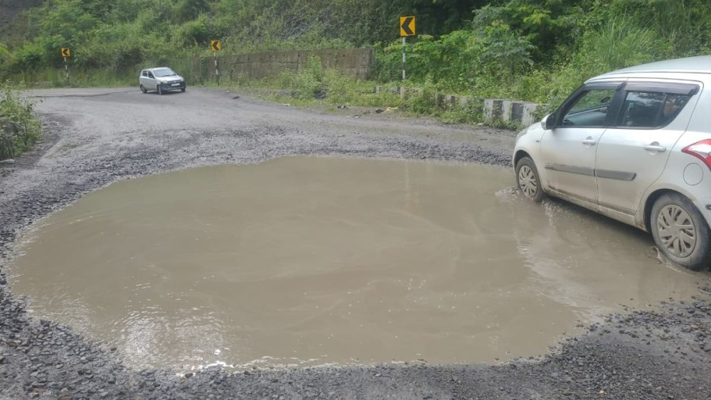A car passes through a portion of deplorable road condition towards Dzii-ii along NH- 29 Kohima- Jessami on August 14. (Morung Photo)