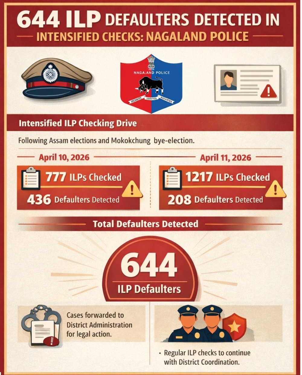 Nagaland Police detected a total of 644 Inner Line Permit (ILP) defaulters during an intensified checking drive carried out across districts bordering Assam on April 10 and 11.