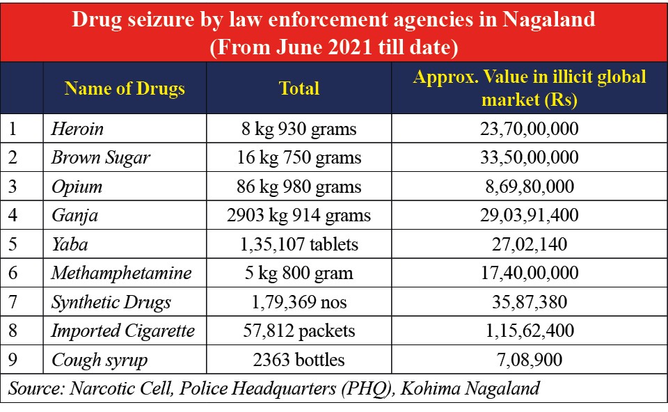 Presenting the supply reduction scenario in the state during the during the observance of the ‘International Day Against Drug Abuse and Illicit Trafficking’ at Capital Convention Centre, Kohima, Superintendent of Police, Narcotic Cell, Police Headquarters (PHQ), Bendang Jamir informed that the seizures were from June 2021 till date.