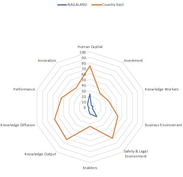 With an efficacy ratio of 0.27 and a score of 14.11, Nagaland “underperformed” in a majority of the indicators (termed as ‘enabler pillars’ and ‘performance pillars’) used to judge the State’s score. Nagaland “underperformed” in terms of human capital, investment, safety and legal environment, knowledge workers and knowledge output.