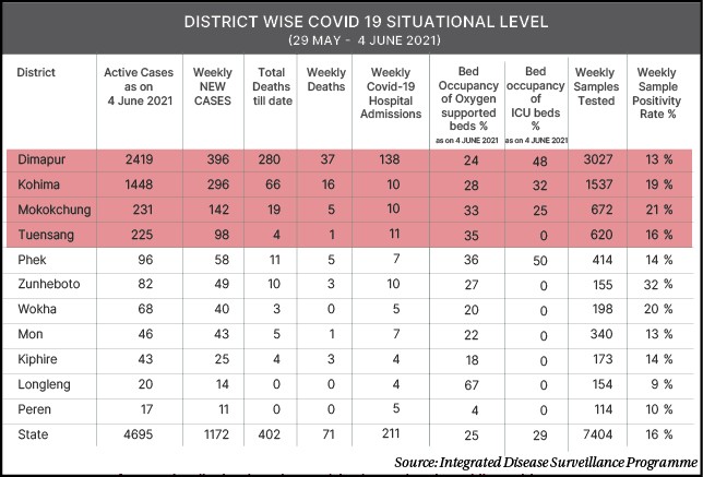 As on June 4, the total COVID death toll in Dimapur stood at 280, followed by 66 in Kohima, 19 in Mokokchung, 11 in Phek, 10 in Zunheboto, 5 in Mon, 4 each Kiphire and Tuensang, and 3 in Wokha. Only Peren and Longleng were still to report a fatality.