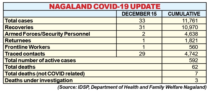Meanwhile, the two-member fact finding team, comprising Dr MD Jamil, NEIGRIHMS, Shillong and Dr SR Karmakar, AIIH&PH, Kolkata, arrived in the state on December 13 to conduct an in-depth review of the state's COVID-19 response. It was informed that the duo held meetings with the District Task Forces, visited COVID hospitals, and COVID Care Centers both in Dimapur and Kohima.