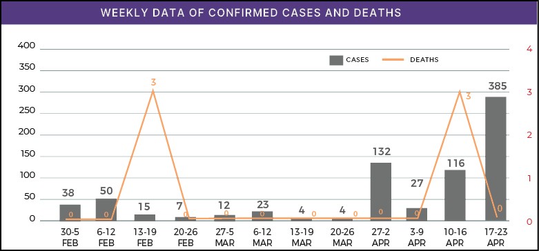 The last time the weekly tally crossed the 300-mark was in between December 5-11, 2020, during which 329 cases were reported. It dropped to 198 the subsequent week after which the weekly score dipped consistently to hover below the 100-mark till March-end.