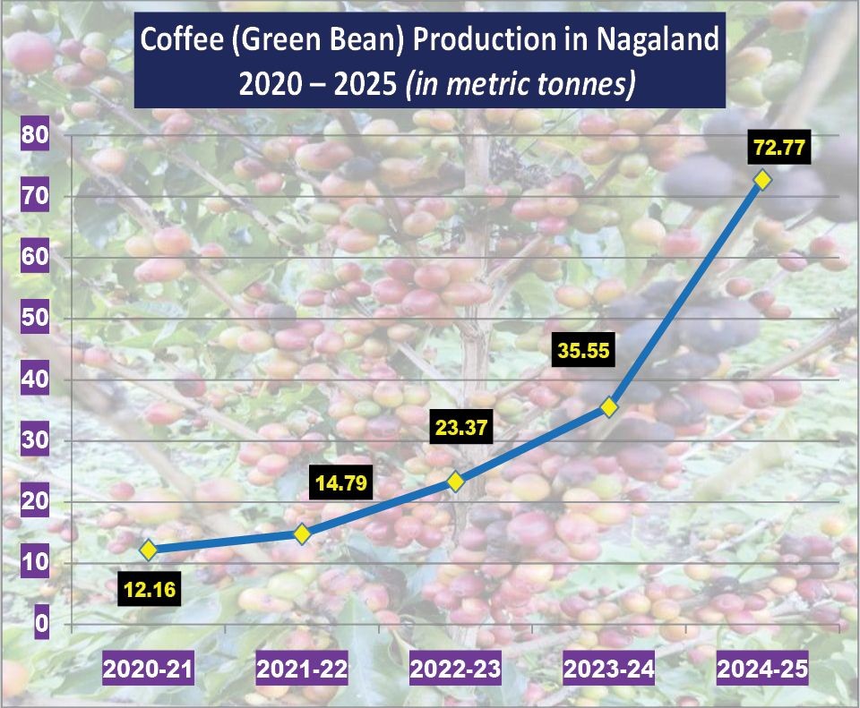 Coffee production in Nagaland has recorded a sharp rise over the past five years, increasing from 12.16 metric tonnes (MT) in 2020–21 to 72.77 MT in 2024–25, reflecting around near six-fold jump in production during the last five years.