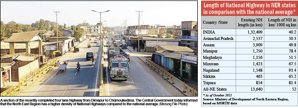 Nagaland has the longest length of National Highways (NH) per 1000 sq km in the North East Region (NER) while the region as a whole has more NH density than the national average, the parliament was informed on December 2.