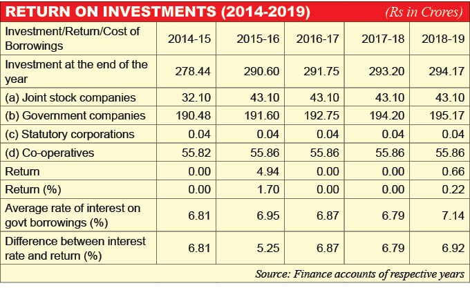 The average return on this investment was ‘nil’ during the years 2014-15, 2016-17 and 2017-18 while there was a return of Rs 4.94 Crores during the year 2015-16 and Rs 0.66 Crores during the year 2018-19. This, the report stated, indicated “non performing investments.”