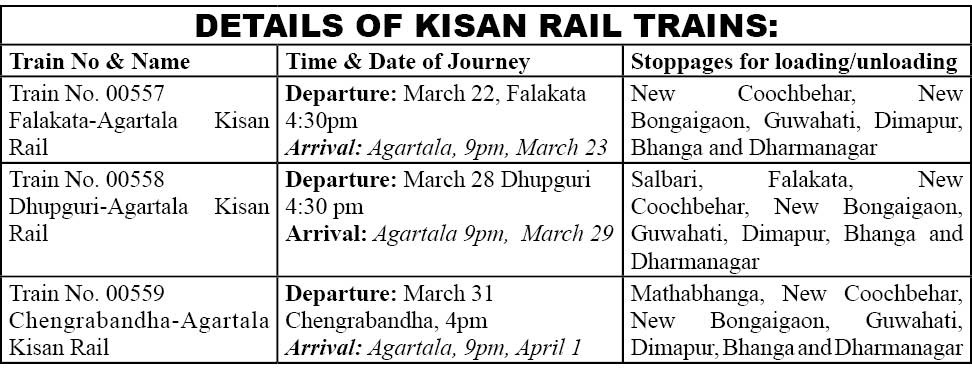 Guwahati, March 20 (MExN): The Northeast Frontier Railway (NFR) has decided to run three Kisan Rail trains to Agartala for transportation of potatoes during this month for the benefit of the farmers and transporters, an official release informed.