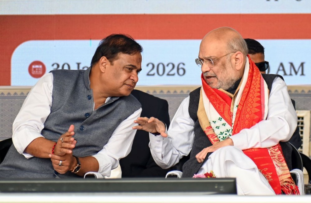 Dibrugarh: Union Home Minister Amit Shah and Assam Chief Minister Himanta Biswa at the laying of the foundation stone of several development projects at Khonikor in the Dibrugarh district of Assam on Friday, January 30, 2026. (Photo: IANS)