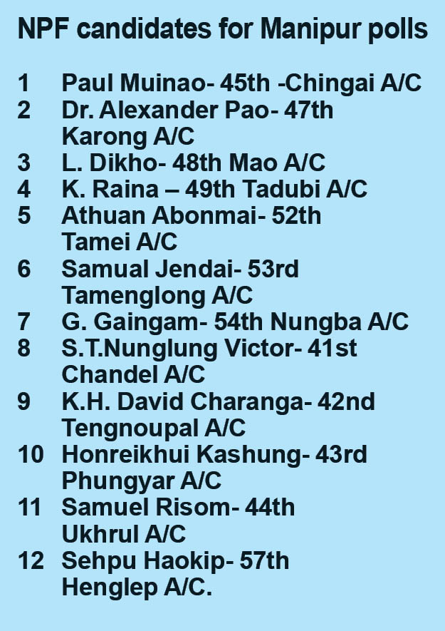 Making its maiden entry into Manipur state’s legislative assembly polls, the Naga People’s Front (NPF) central office today formally distributed NPF party tickets to 12 candidates to contest in the 12 assembly constituencies.