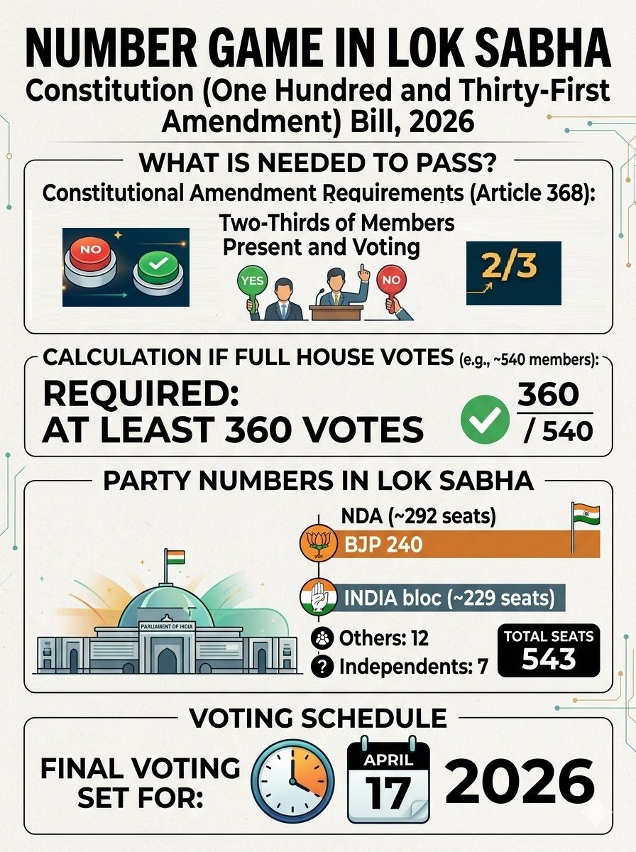 This numerical balance sets the stage for a fierce contest over the Constitution (One Hundred and Thirty-First Amendment) Bill, 2026, the Jammu & Kashmir Laws (Amendment) Bill, 2026, and the Delimitation Bill, 2026, all scheduled for voting in the ongoing special Parliament session.