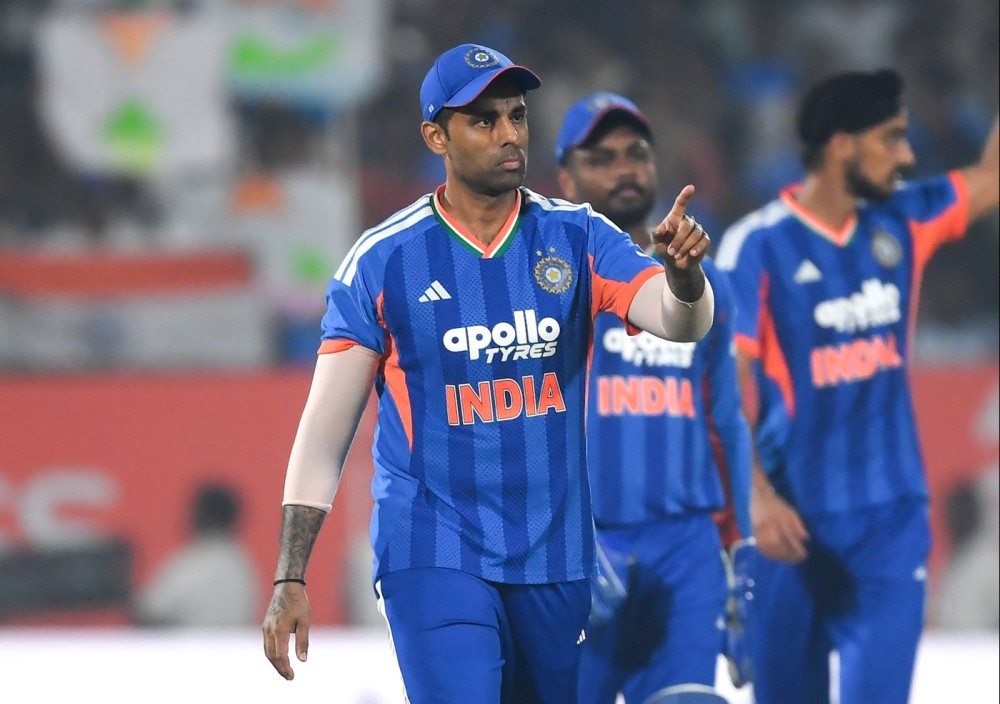 Visakhapatnam: India's Suryakumar Yadav gestures as he celebrates the dismissal of New Zealand's Rachin Ravindra during the fourth T20 International match between India and New Zealand at the ACA–VDCA Cricket Stadium in Visakhapatnam on Wednesday, January 28, 2026. (Photo: IANS)