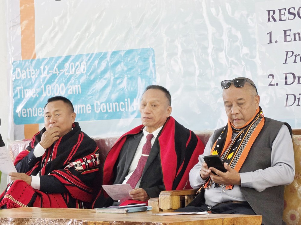 L-R: Kekhwengulo Lea, President, Tenyimia Union Nagaland, Dr Zavise Rume, Director, International University and Deo Movi, President of Razeba Public Organisation during the 35th General Session of the Razeba Public Organisation at Tsupfume Council Hall, Phek on April 11.