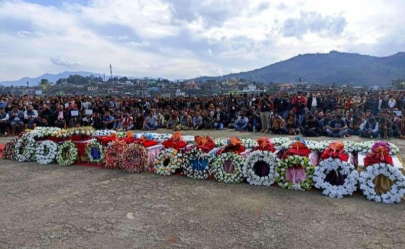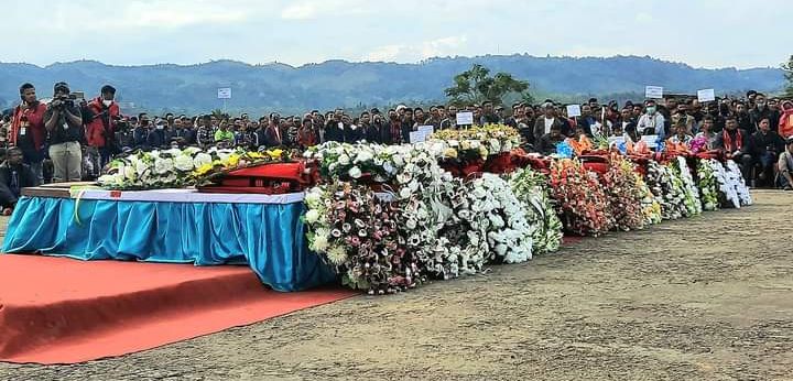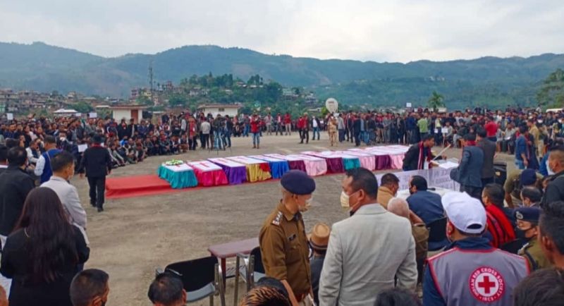 Recounting the incident, the report informed that the Konyak Union had announced for a mass funeral service of the 13 deceased civilians at the Helipad, Mon town, whose mortal remains were brought there from Oting village.