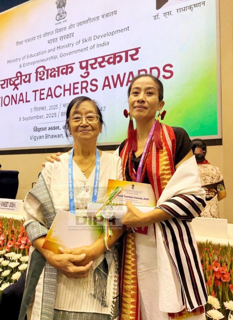 Peleno Petenilhu of John Government Higher Secondary School, Viswema, accompanied by her mother, Meeyong P Shüya, a retired teacher herself, after receiving the National Teachers Award 2025 at Vigyan Bhavan, New Delhi. (DIPR Photo)