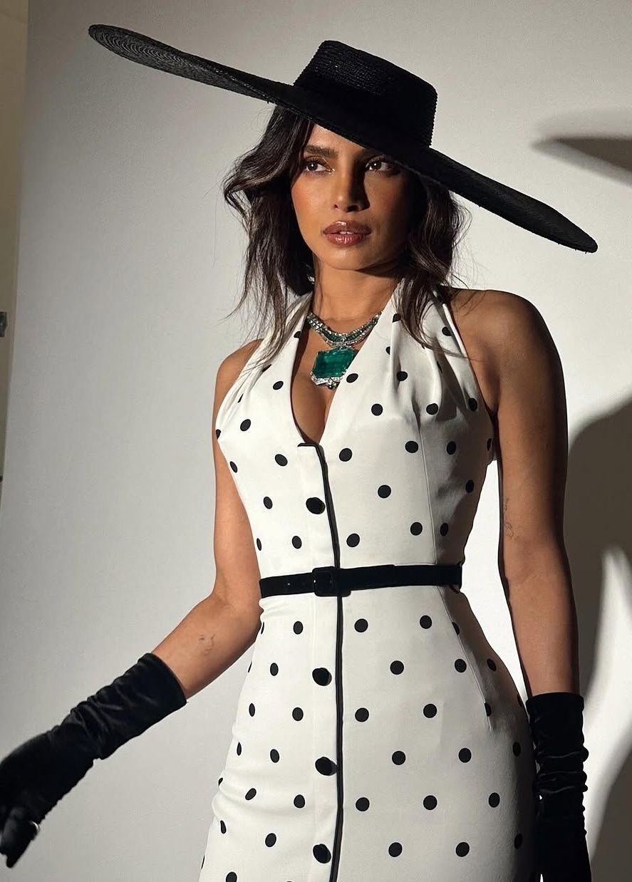 Priyanka took to Instagram, where she shared her look for the event dressed by Olivier Rousteing of luxury fashion house Balmain for the 2025 theme "Superfine: Tailoring Black Style”. She wore a white halter-neck dress with black polka dots with a black belt at the waist and black buttons down the center. She completed her look with a big black wide-brim hat and emerald green neckpiece.
