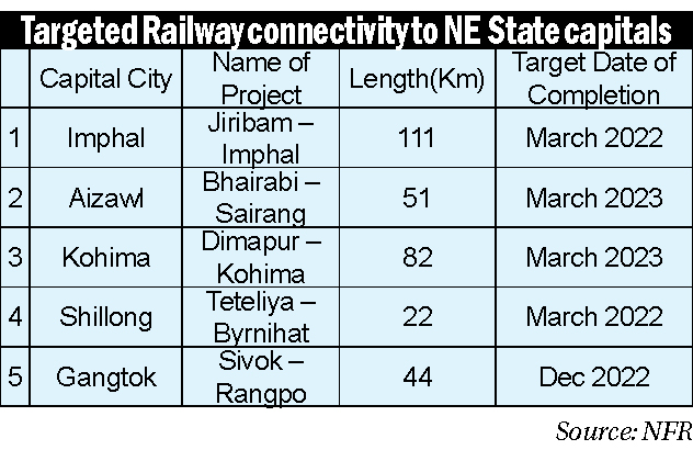 While all the NE States (except Sikkim) are currently connected by Rail network so far, only the state capitals of Assam, Tripura and Arunachal Pradesh are under its ambit.
