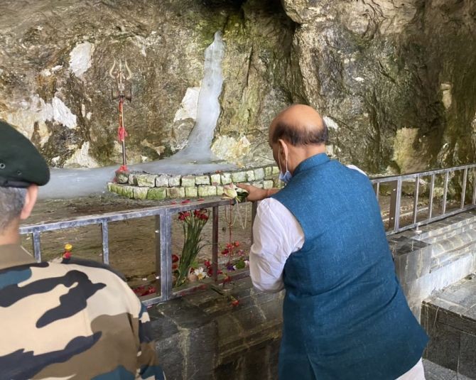 New Delhi, July 18 (PTI): Defence Minister Rajnath Singh on Saturday visited the holy cave of Amarnath and offered prayers.