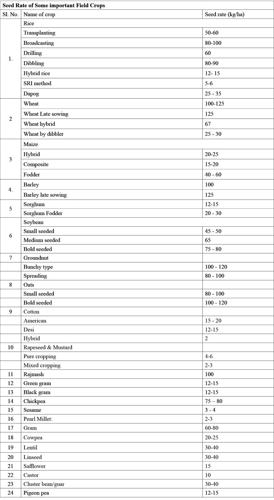 Amount of seed rate: The actual seed rate of crops for sowing is fixed, however it is changeable because the seed rate of different crops depends on various factors. Some factors determining seed rate of different crops are as follows: