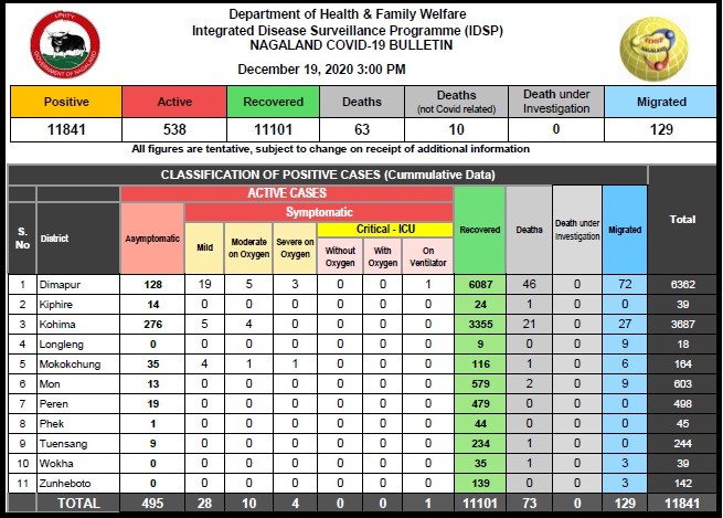 Dimapur, December 19 (MExN): Nagaland recorded 9 new COVID-19 positive cases on Saturday, taking the state’s tally to 11,841. According to updates from the Department of Health and Family Welfare, 8 of the new cases were from Kohima while 1 was from Mokokchung. On the other hand, 25 patients who were previously COVID-19 positive have recovered in the last 24 hours. This takes the total number of recoveries in the state to 11,101 and the number of active cases now stands at 538. Of the active cases, 495 are asymptomatic, 28 are mild, 10 moderate on oxygen, 4 severe on oxygen and 1 on ventilator. The state has recorded a total of 73 deaths out of which 10 were declared “not COVID related” after review by the state death review committee. Among the districts, Kohima has the highest number of cases with 276, Dimapur- 128, Mokokchung-35, Peren-19, Kiphire- 14, Mon-13, Tuensang- 9, and Phek-1. Longleng, Wokha and Zunheboto districts currently have no active cases.