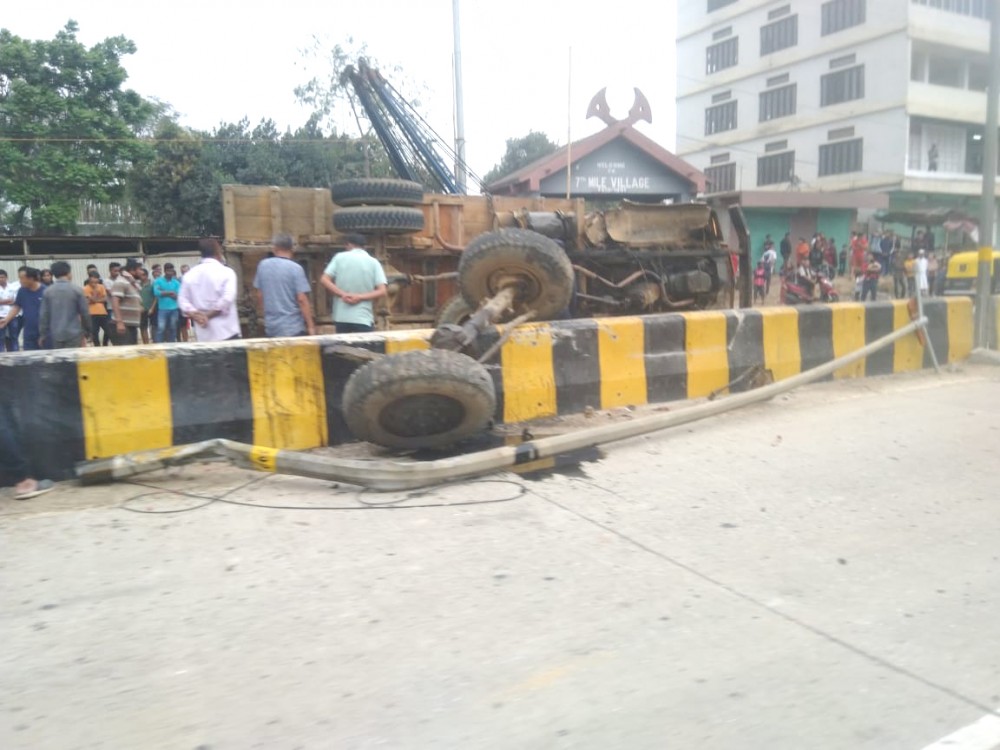 A truck turned over on its side following a mishap on NH 29 at 7th Mile, Dimapur on February 28. The truck was reportedly speeding and hit some utility poles mounted on the lane divider before flipping over. No other vehicle was involved in the mishap. As per the police, the driver was absconding and there was no report of casualty. (Morung Photo)