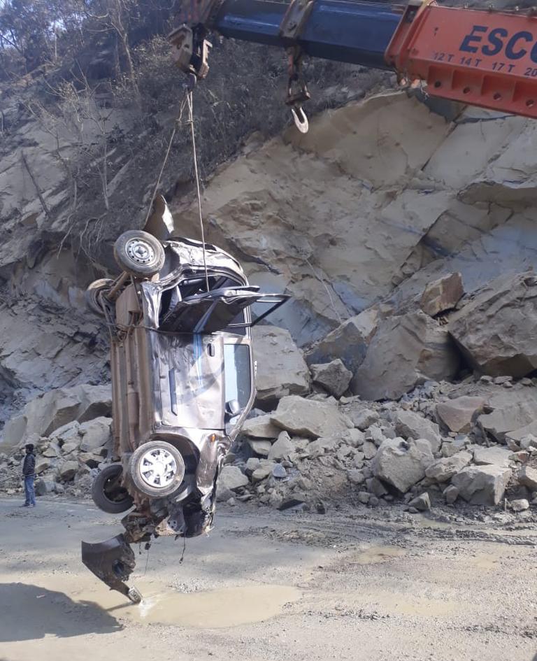 Four vehicles got caught in the avalanche comprising huge rock debris, injuring three persons— one woman and two men. The damaged vehicles included a Bolero, Tata pickup, Gypsy and Wagon-R. The woman was in the Bolero and the two men were in the Gypsy that went off the road and was almost crushed by the boulders. All three were admitted to the CIHSR.