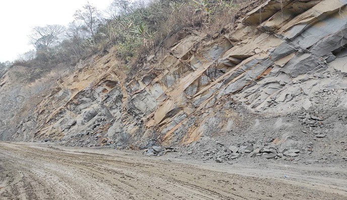 Till about 25/30 years back we have not known the modern earth cutting machineries but the only earth cutting machinery available was the bulldozer. In our youthful days it was the human labor that was the main work force involved in earth cutting of the road construction using jumper and spade with locally made earth mover contraption. It is common knowledge even to a simple villager that earth cutting in road construction starts from the top and dressing down to the bottoms of the road face level. We have also done rock blasting but we used to do the blasting of the rock from the top, down to the bottom. But very unfortunately, at the NH-29 the construction Engineers are blasting the rock from the bottom base to scoop out the hill side to get the desired width of the road. If you are travelling on this road driving a vehicle, just pull off to the road shoulder and inspect the rock blasting site where you will witness half scooped out rock leave behind in the outcrop rocks all cracked and jagged. By all common sense the heavy blasting has caused cracks and fissures all along the plane of the rock strata and has already upset the stability of the strata of the rock bed and soil formation thereby weakening the naturally balanced stability. During the summer rainfall surface run of water will percolate into the fissures which shall solidify during the cold winter nights. Water that percolated into the fissures when solidify will increase in volume and shall act as good wedge inside the fissure which will automatically expand the rock fissures. Repeated such expansion over the year will create pressure on the surrounding rock mass ultimately triggering to rock slide which shall continue to happen even long after the present road construction works are over as the whole stretch of the uphill outcrop is holding hundreds of fissures and cracks as seen in the photo.