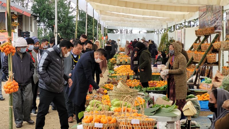 The festival witnesses sale of oranges, handloom, organic vegetables, orange saplings, ice cream, fast food, juice, metal tools, beef innards, Muodi, Galho etc.