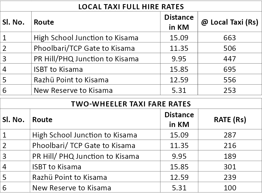 Kohima, November 17 (MExN): The Regional Transport Authority (RTA), Kohima office has fixed the fare rates for local taxi and two-wheeler taxi to Naga Heritage Village, Kisama from different pick-up/starting points and vice versa.