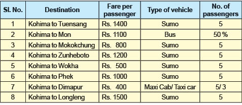 Reiterating the fares to Kohima fixed by respective district RTA, the passenger fare from Kohima to different districts shall be as follows: