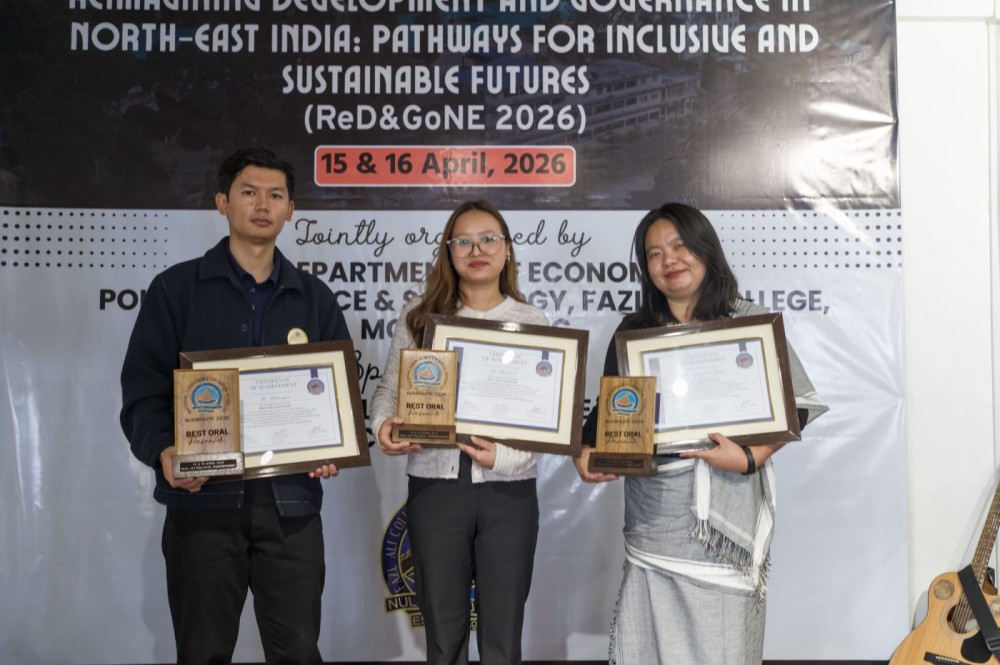 Best Oral Presenters, Dr Watitemjen, Cheme S and Dr Limasenla Jamir with their awards at the two-day national conference organised by the Departments of Economics, Political Science, and Sociology, Fazl Ali College, on April 16.