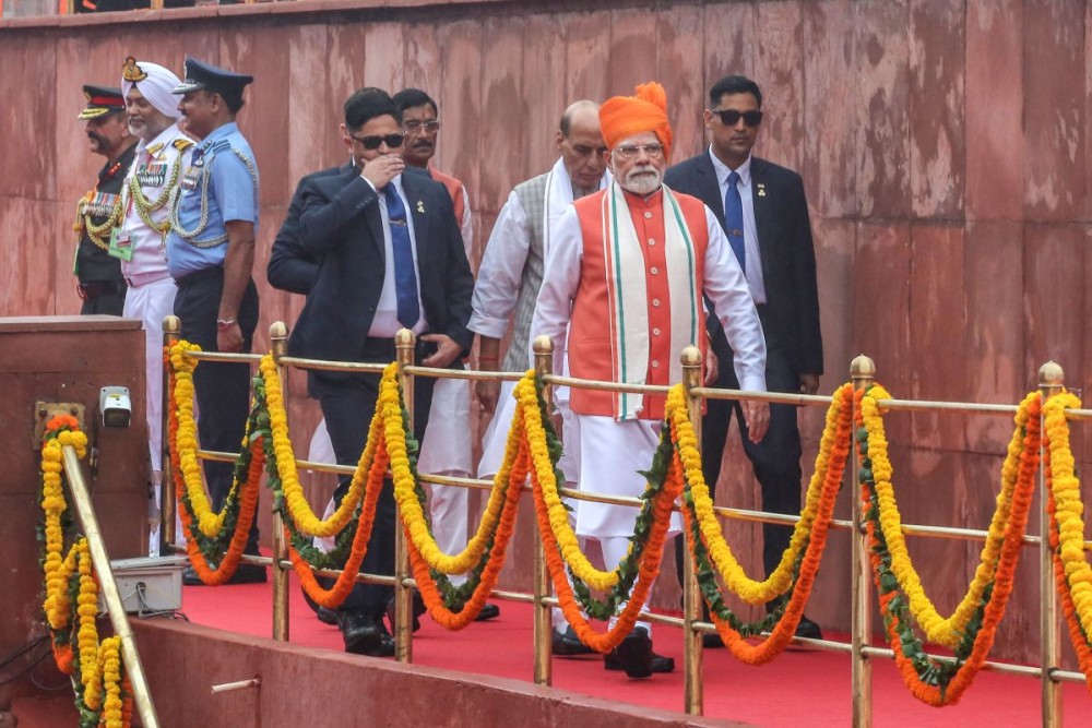 New Delhi: Prime Minister Narendra Modi walks along with Defence Minister Rajnath Singh during the 79th Independence Day celebrations at the Red Fort in New Delhi on Friday, August 15, 2025. (Photo: IANS/Qamar Sibtain)