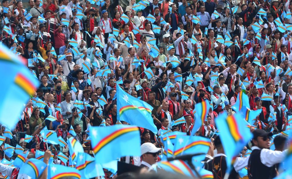 NSCN-IM General Secretary Th. Muivah was warmly received by tens of thousands of people holding blue and rainbow flags. (Morung Photo)