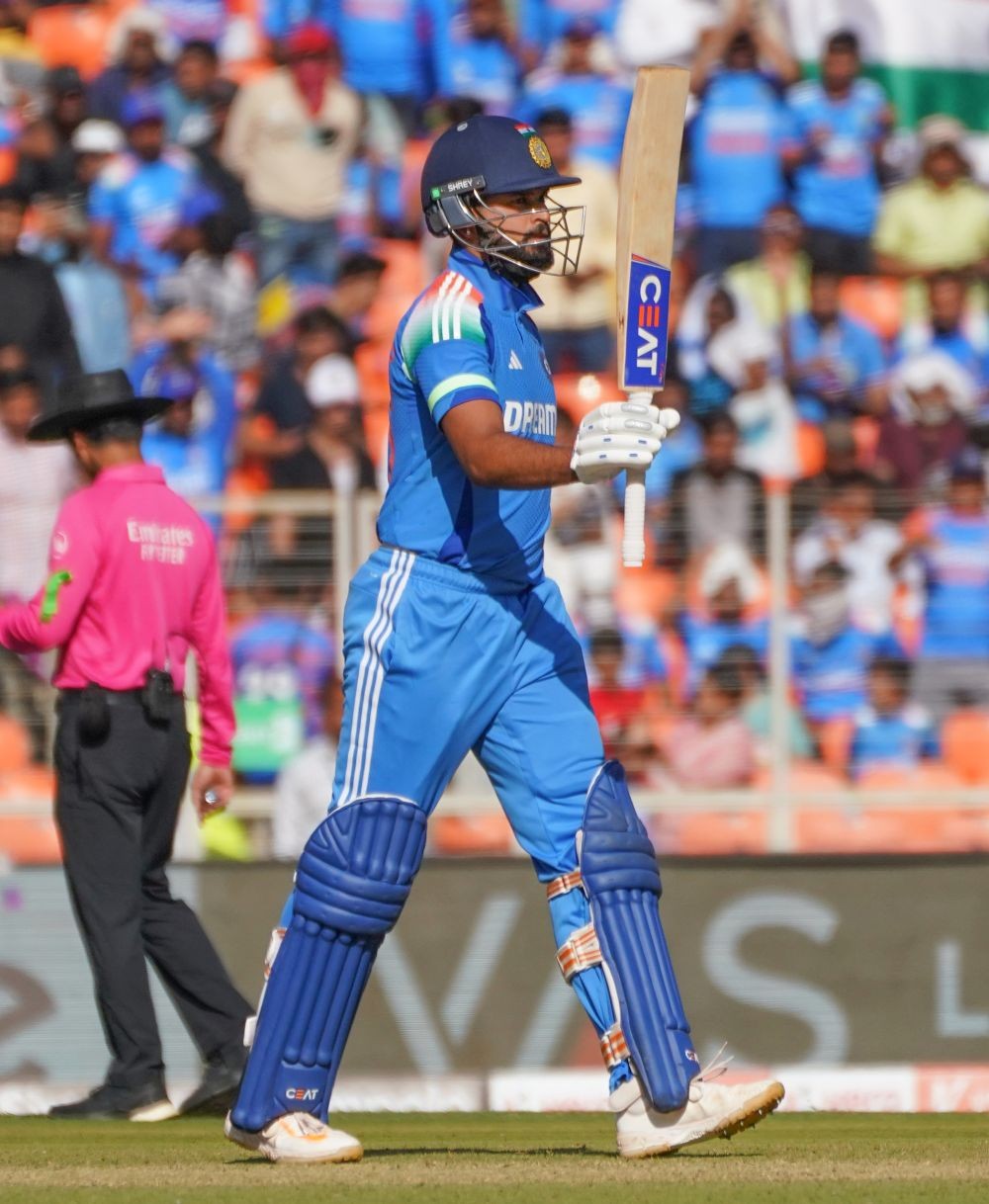 Ahmedabad: India's Shreyas Iyer celebrates his half-century during the third ODI match between India and England at Narendra Modi Stadium in Ahmedabad on Wednesday, February 12, 2025.(Photo: IANS/Siddharaj Solanki)