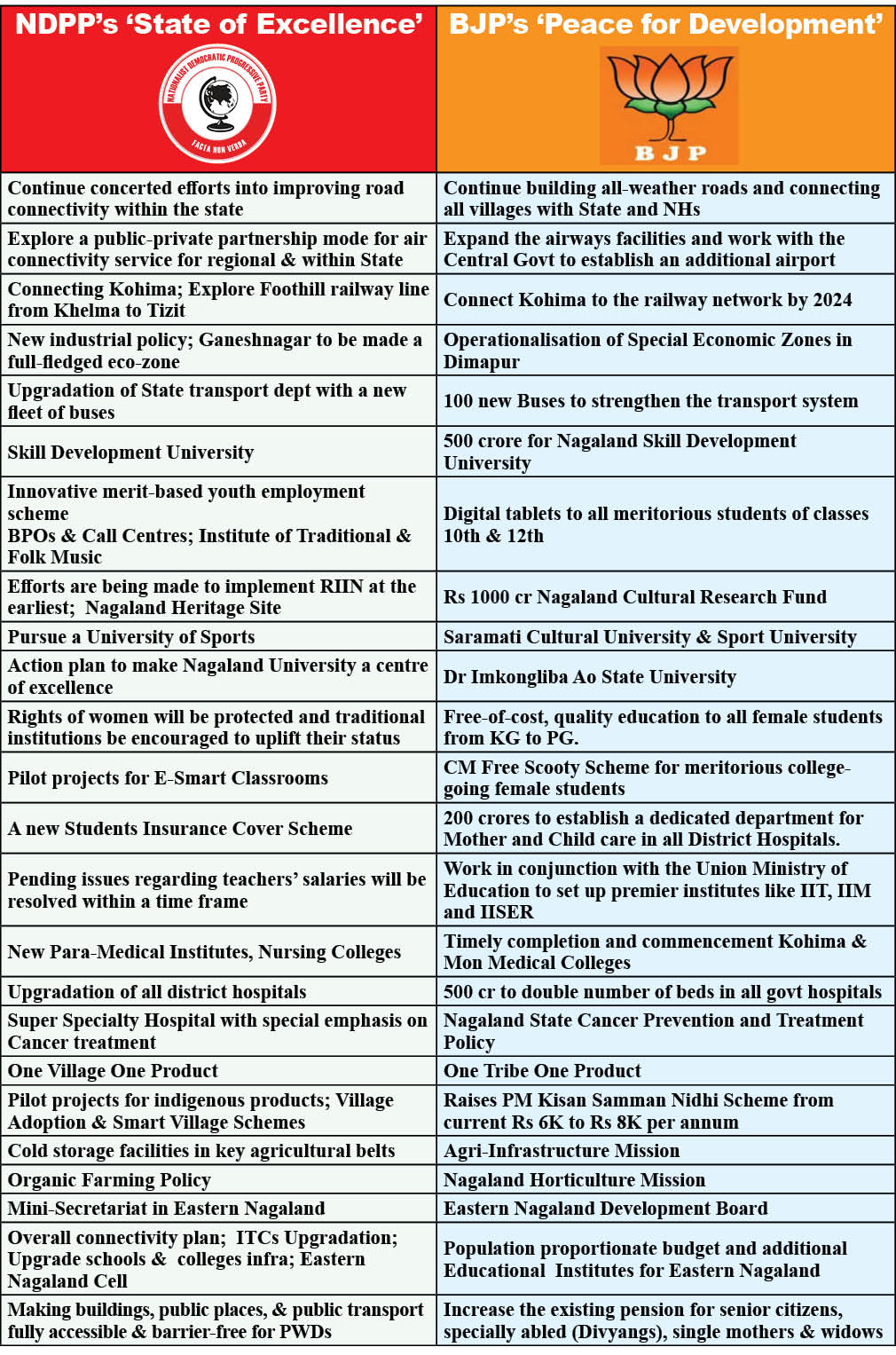 These, among many others, are the possibilities the citizens of Nagaland must look forward to if the ruling alliance of Nationalist Democratic Progressive Party (NDPP)-Bhartiya Janata Party (BJP) fulfil at least half of the pledges in their respective manifestos in the run-up to the general elections to the 14th Nagaland Legislative Assembly held on February 27.