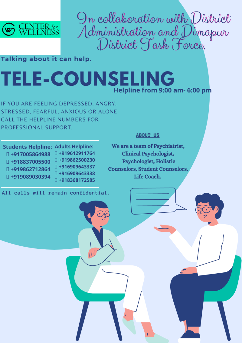 Dimapur, May 28 (MExN): The Center for Wellness in collaboration with the Dimapur District Administration and District Task Force has launched the ‘Talking About It Helps’ initiative, a Free Tele-Counseling Helpline from 9:00 am - 6:00 pm.