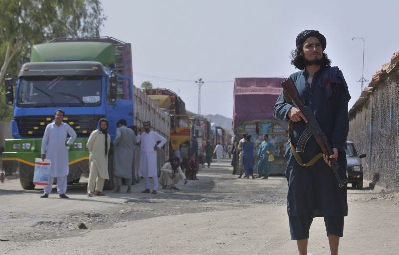orkham: A Taliban fighter stands guard on Afghan side while people wait to cross at a border crossing point between Pakistan and Afghanistan, in Torkham, in Khyber district, Pakistan, Saturday, Aug. 21, 2021. In the current situation of Afghanistan, pedestrian movement has limited in Torkham border, only stranded people in both sides and trucks taking goods to Afghanistan can passes through this border point. (AP/PTI Photo)