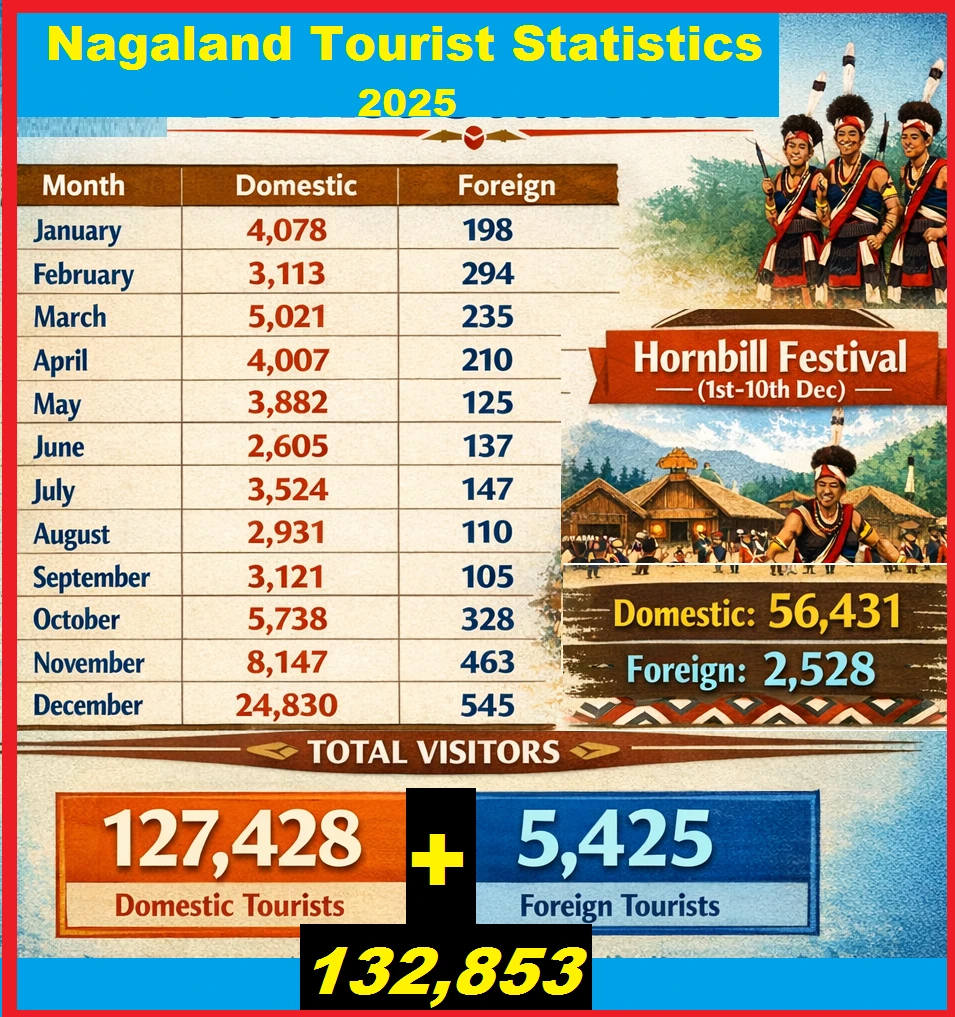 In December 2025, Nagaland recorded 24,830 domestic and 545 foreign tourists, but when the Hornbill Festival-specific figures are included, the numbers rise sharply to 81,261 domestic and 3,073 foreign visitors for the month.