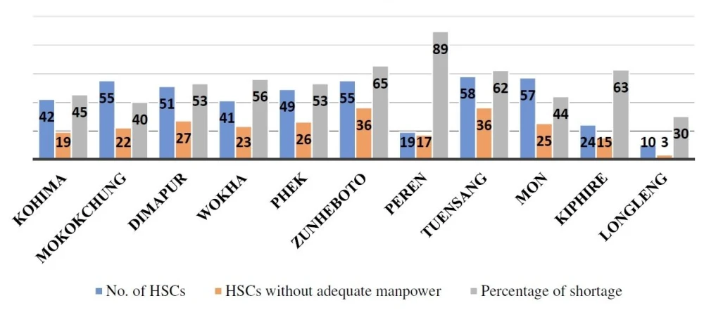 Peren district recorded the highest shortage, with 17 out of 19 HSCs facing shortage of manpower. The report also noted that no separate manpower has been sanctioned for Line Services and Support Services for paramedics and other staff in health facilities across the state.
